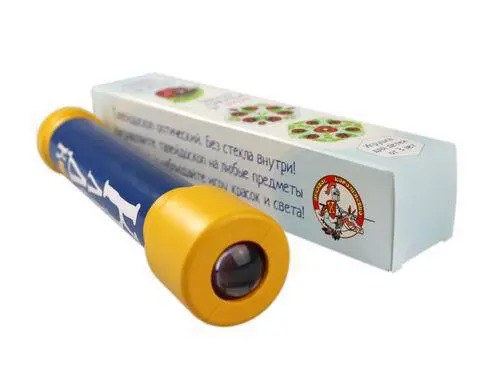 Калейдоскоп (талейдоскоп) состоит из пластиковой желтой трубки длиной 21 см, диаметром 4 см с прочным выпуклым стеклом.