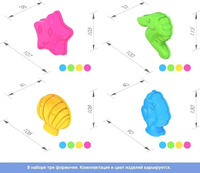 В каждый набор входит по 3 цветные формочки. Как и вся продукция НОРДПЛАСТ, формочки изготавливаются из отличного прочного пластика без вредных примесей. Отличительная черта формочек производства НОРДПЛАСТ в том, что формочки имеют красивую деталировку сн
