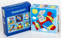 В набор «Транспорт» входит 9 пластмассовых кубиков размером 4 см.Собрать красочные и простые картинки паровозика, вертоа, ракеты, самоа, машинки и кораблика из девяти кубиков вполне по силам любому ребенку в возрасте от трех . Особенно, если он ранее уже собирал картинки из 4 или 6 кубиков.
