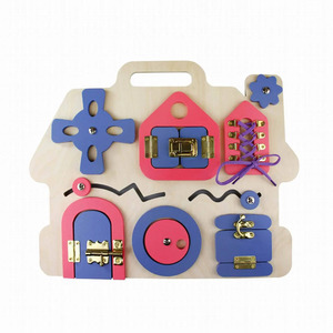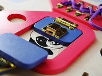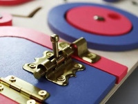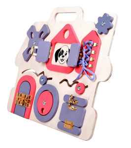 Бизиборд изготовлен из высококачественной неокрашенной фанеры толщиной 7мм, на котором размещены познавательные элементы: замочек, щеколда, шнуровка и другие предметы. Деревянные элементы окрашены безопасными красителями на водной основе и надежно крепятся к доске.