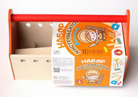 Набор строительных инструментов для детей (большой).Состав: молоток (ручка – 1,8 х 18 см; голова – 3 х 9,2 см), пила (27,5 х 10,5 х 1 см), ключ (19,5 х 4,5 х 0,6 см), отвертка (14,5 х 4 х 0,6 см), уголок (ручка – 1,8 х 3,2 х 0,3 см; окрашенная часть – 10,5 х 3,3 х 1 см), плашки большие – 2 шт. (12,5 х 3 х 0,6 см), плашки маленькие – 2 шт. (9,5 х 3 х 0,6 см), болты – 6 шт., гайки – 6 шт., ящик для инструментов – 1 шт. (29 х 14,5 х 19 см). Материал: дерево, древесные материалы. Рекомендовано для детей от 3 лет. С набором инструментов ребёнок развивает мелкую моторику, фантазию, воображение и пространственное мышление, знакомится с назначением того или иного приспособления в быту.