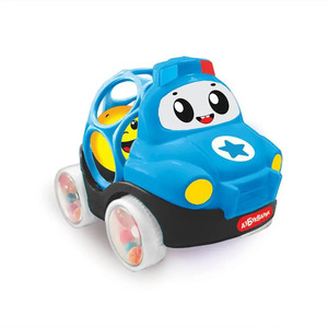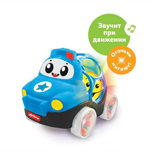 Чудо-машинка для самых маленьких – с мячиком в кузове! Она звучит при движении! Малыш будет катать полицейскую машинку – и слушать веселые песенки («Бибика», «Песенка про счет», «Гудят машины»), мелодии и звуки транспорта. Колесики звенят, как погремушка, огоньки мигают, а мягкий кузов так приятно потрогать пальчиками!Игра с этой машинкой развивает у ребенка музыкальные способности, двигательную активность, тактильные ощущения.