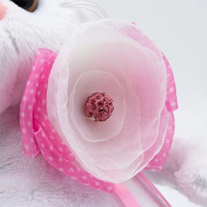 На Ли-Ли очень нежное украшение ручной работы – бант-цветок. Аксессуар выполнен из капроновой ленты цвета розовой карамели с белыми горошками, нескольких слоёв белой органзы, розовой пуговки со стразами и атласной нежно-розовой ленты.
