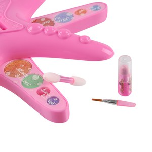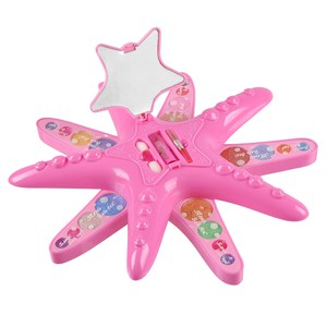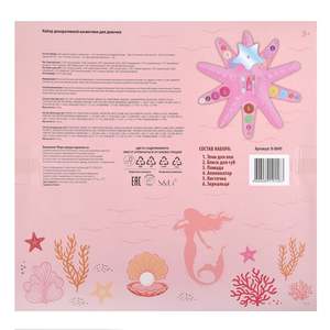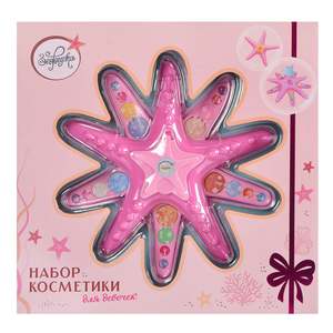 Необычный и очень привлекательный наборчик детской косметики украсит туалетный столик юной русалочки на зависть всем подружкам!Состав набора: кейс-морская звезда с зеркальцем - 1 шт, тени для век на пудровой основе - 10шт/10 оттенков, блеск для губ - 10 шт/10 оттенков, помада для губ - 1 шт/1 оттенок, кисточка - 1шт, двусторонний аппликатор - 1 шт.