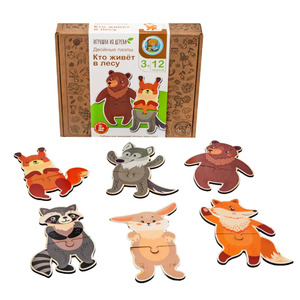 Пазлы из дерева. Двойные пазлы "Кто живет в лесу" 12 эл. Состав игры: 6 пазлов из древесного материала из 2 элементов каждый. Размер каждого пазла 9х13 см. Древесный материал, картон. Игра предназначена для детей старше 3 лет.