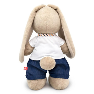 Зайка в темно-синих джинсах и белоснежной футболке из х/б трикотажа. Спереди на красивой полосатой ленте у Зайки объемный фотоаппарат, выполненный вручную из принтованной ткани.