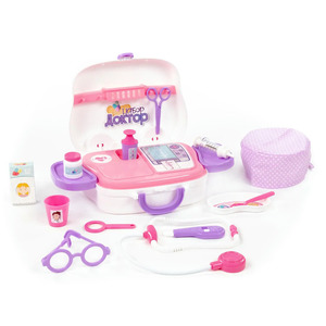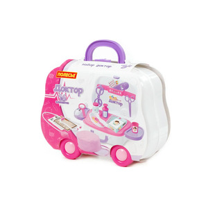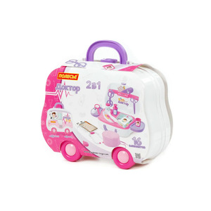 С набором «Доктор №18» ребенок сможет в игровой форме освоить важную и нужную профессию доктора. 16 элементов набора компактно расположены в чемоданчике на колесах. Таким образом набор легко перемещать, толкая перед собой по ровной поверхности либо переносить, взяв за ручку. Набор включает в себя: колпак медицинский; столик для мед. инструментов; боковые полки; - набор наклеек; бланк-рецепт; проверочная таблица окулиста; коробочка для таблеток; набор таблеток; полка-держатель для мед. инструментов; ложечка; лупа; ножницы; термометр; очки; лоток; фонендоскоп; стаканчик; шприц; мерный стаканчик с крышкой; баночка для лекарств.