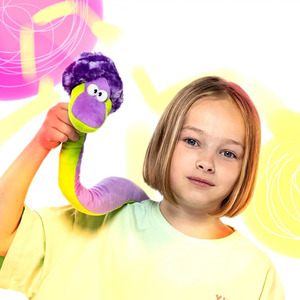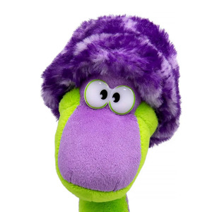 Неоново-яркая Минни сшита из сиреневого и ярко-зеленого софта. На голове у змейки забавная меховая шапочка, которая ей очень идет.
