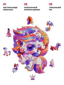 Деревянный пазл Melograno «Единорог Карамелька» – волшебство в каждой детали.Откройте дверь в сказочный мир с этим очаровательным пазлом! 50 крупных деталей из натурального дерева складываются в сладкую розово-голубую картинку с милым единорогом, создавая идеальную головоломку для первого знакомства с пазлами.