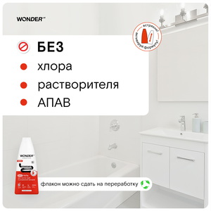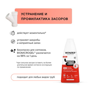 Средство эффективно справляется с любыми засорами благодаря инновационной формуле Biomicrogel S5 на основе натуральных компонентов из овощей и фруктов. Чистящие средства WONDER LAB не содержат токсичных компонентов, опасных для природы или человека.
