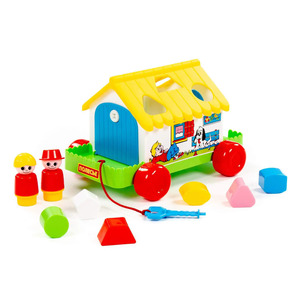 Развивающий домик для детей до 3-х лет. На крыше домика логическая задача - ребенку нужно сопоставить фигурки (6 шт.) с отверстиями-пазлами. С обеих сторон домика есть дверки, которые открываются, и можно достать из домика фигурки. Одна из дверок открывается ключом. Кроме того, в комплект входит 2 фигурки человечков, они устанавливаются в специальные углубления и позволяют ребёнку разыгрывать различные сюжеты. Домик можно катать за собой,благодаря наличию колесиков и шнурка.