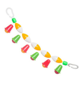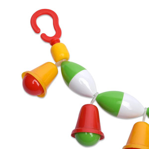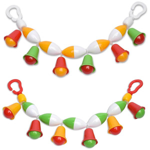 Подвеска представляет собой яркие пластиковые элементы с цветными колокольчиками. Элементы при тряске забавно гремят. На концах резинки расположены пластиковые кольца, при помощи которых подвеску можно закрепить на коляске.